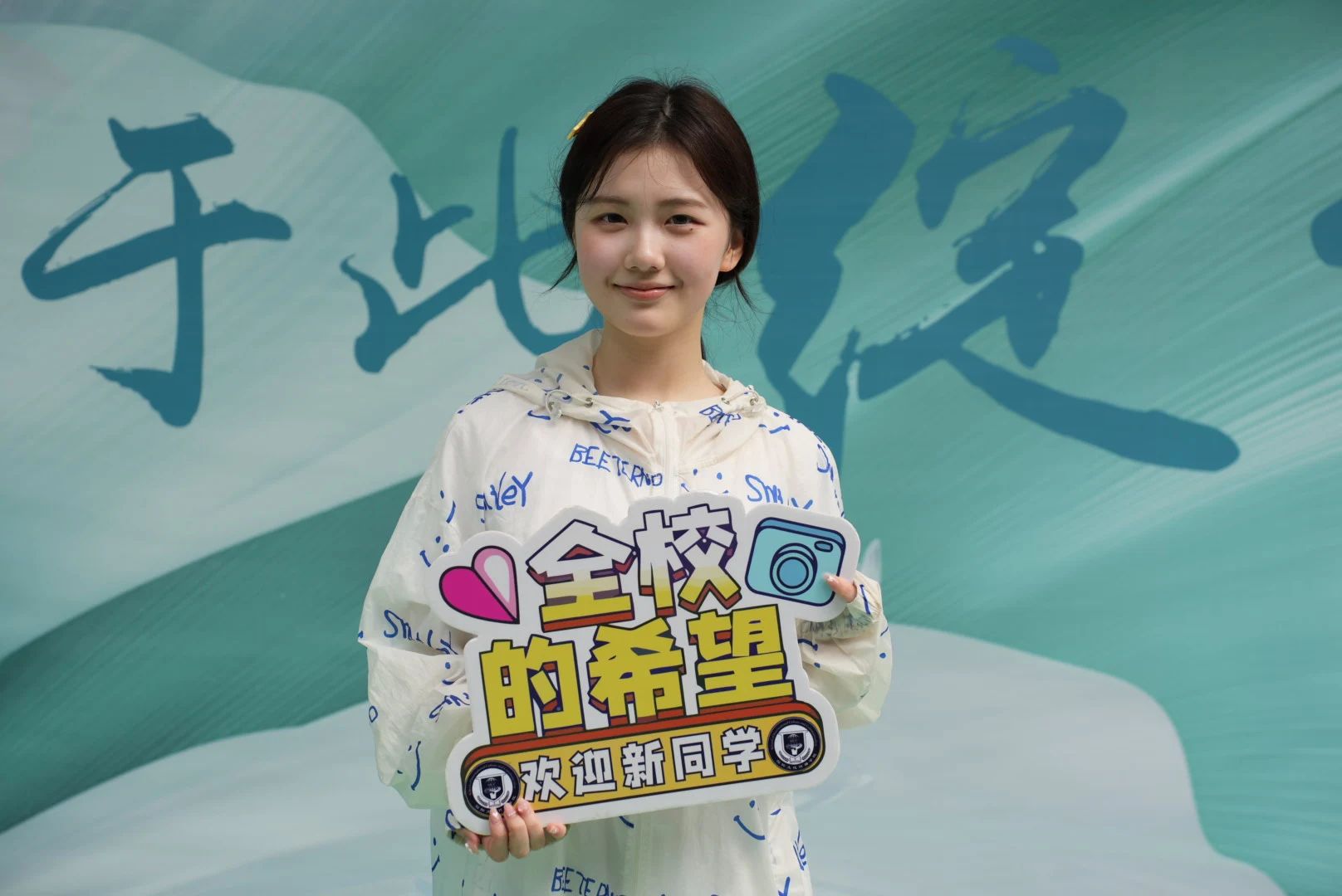 传媒大道上,以“绽放”为主题的大型喷绘吸引了许多新生拍照打卡。“绽放”取自于杭州亚运会的主题,鼓励新生们传承亚运精神,在校园内、在社会上、甚至国际舞台上绽放青春的独特魅力。也是学院对每一朵浪花们的美好期待。