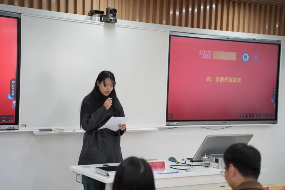 国际文化传播学院23级播音与主持艺术(双语播音)1班姚馨晨同学作为学员代表发言。她结合个人学习与实践活动进行了分享,并表明了积极向党组织靠拢的坚定决心。
